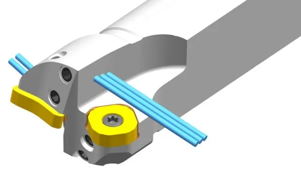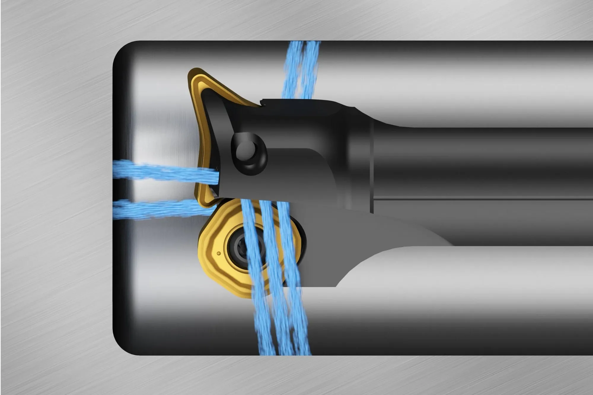 CoroTurn® PI:ssä on useita lastuamisnesterakenteita eri muotoisille komponenteille, mikä varmistaa tarkan lastuamisnesteen syötön, parantaa lastunpoistoa ja vähentää koneistuksen keskeytyksiä.