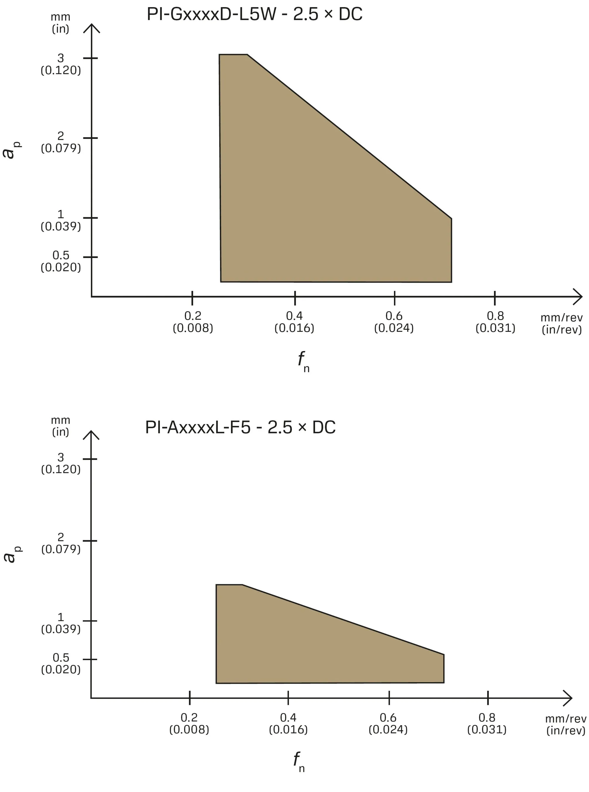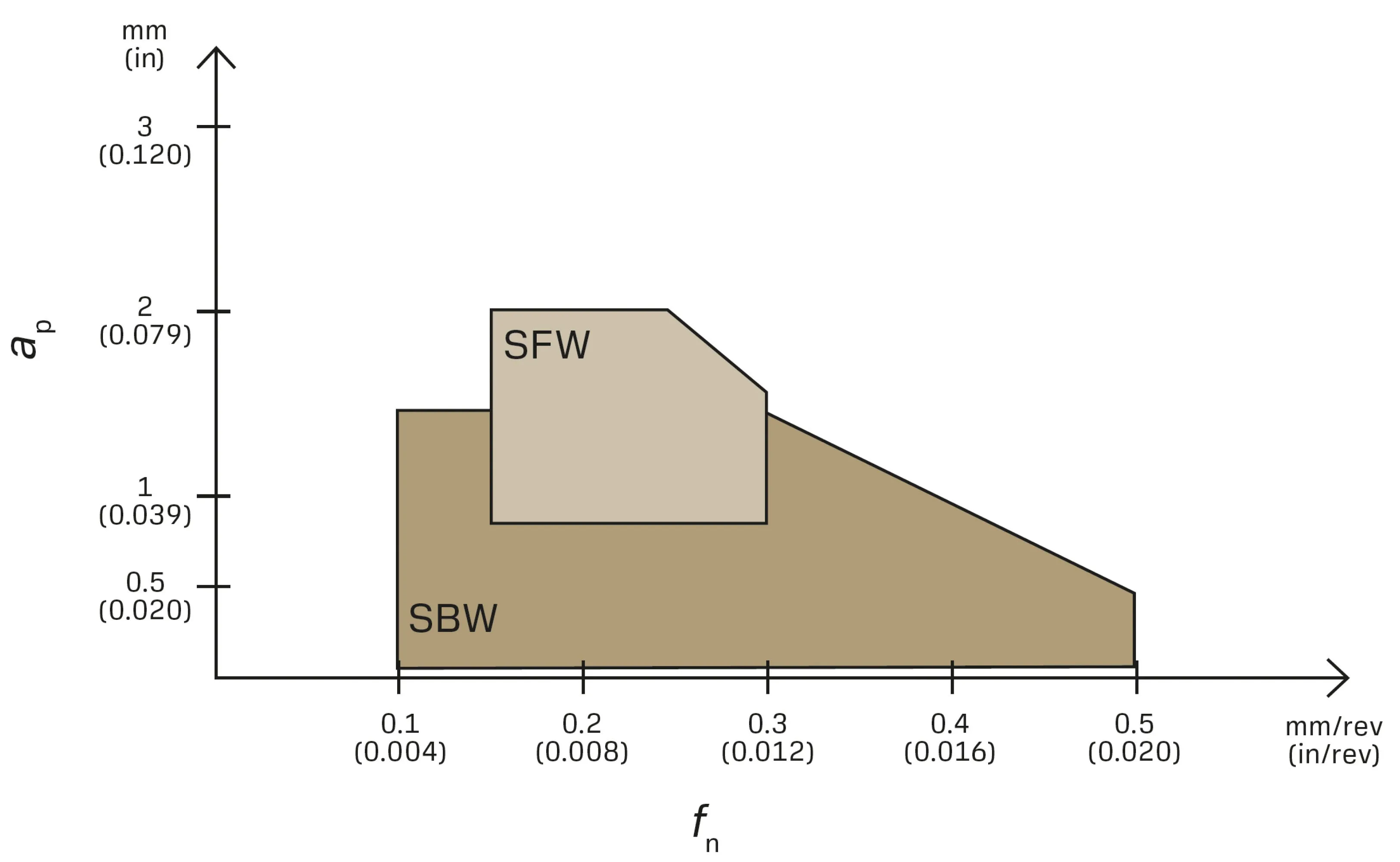 Suosittelemme käyttämään työkalua halkaisijan ja pituuden suhteella 2,5 × DC, jotta suorituskyky voidaan optimoida. Käsittely onnistuu myös 3 × DC ‑pituudella, mutta tällöin lastuamisarvoja tulee säätää liiallisen paineen ja värinän välttämiseksi.