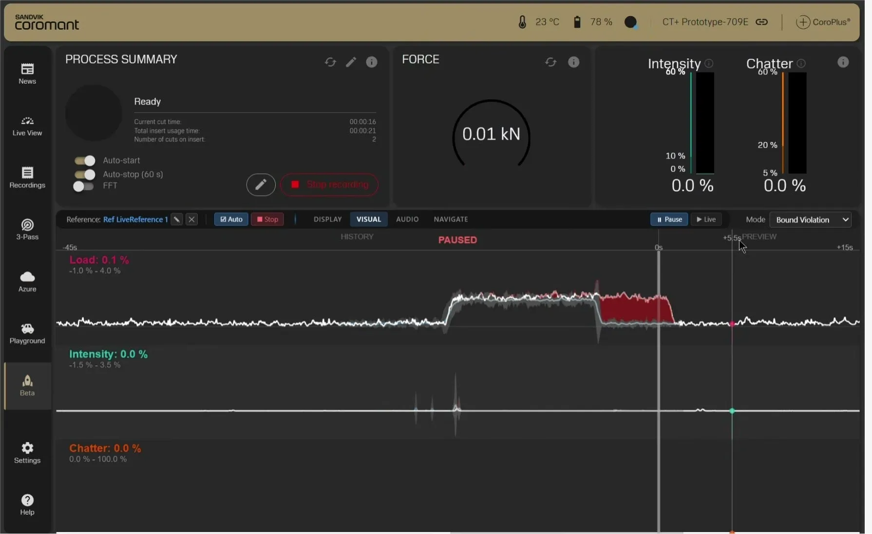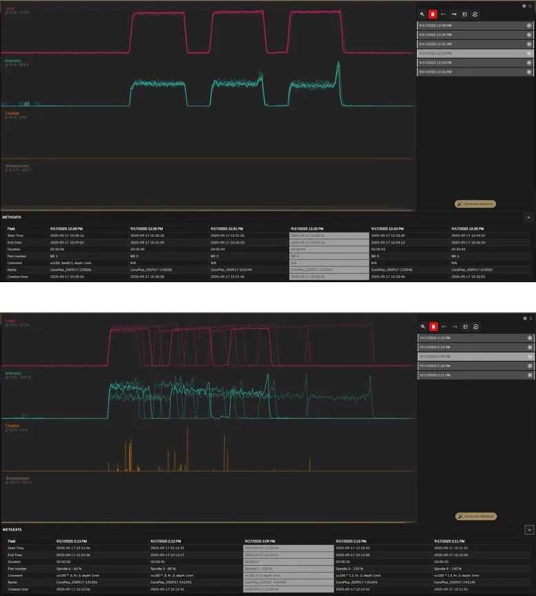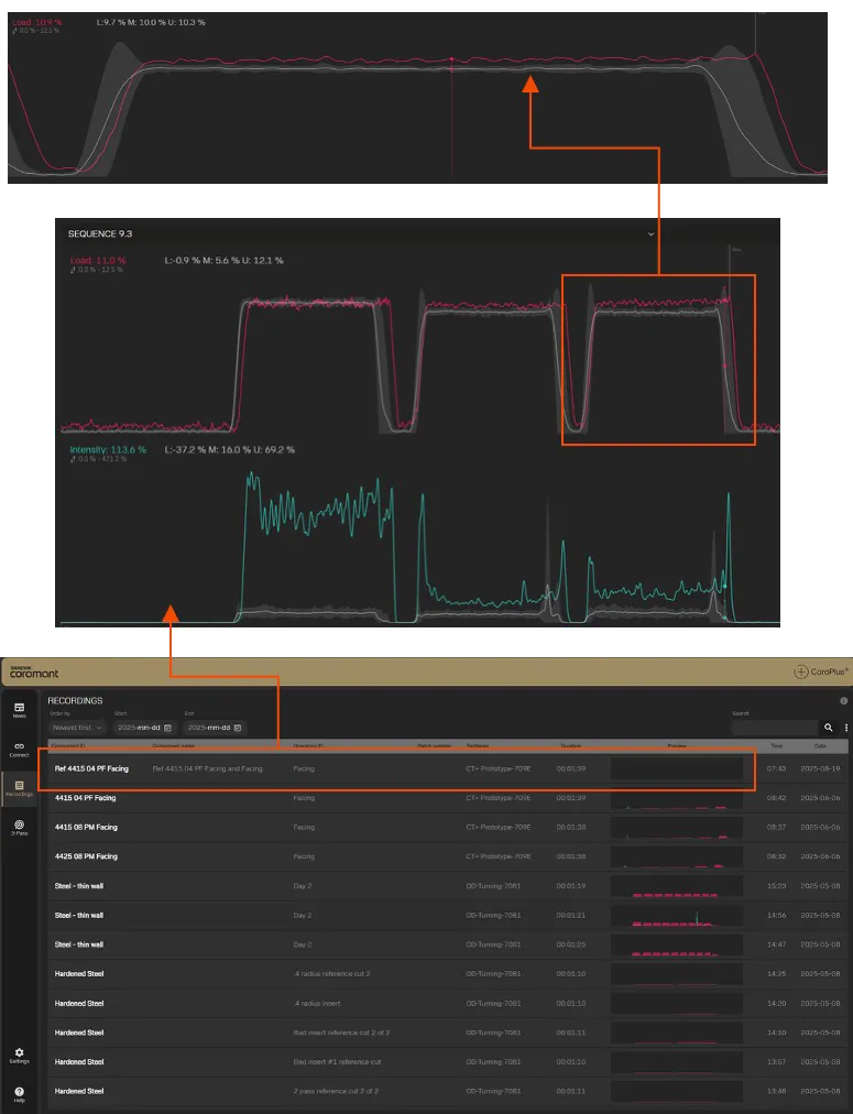 A CoroTurn® Plus felhasználói felület támogatja a forgácsolási adatok élő megfigyelését és utólagos elemzését. A forgácsolási jeleket a megmunkálás során automatikusan rögzítik, és egyedi felvételek formájában tárolják, lehetővé téve az összehasonlítást, a rendellenességek felderítését és a tételek elemzését.