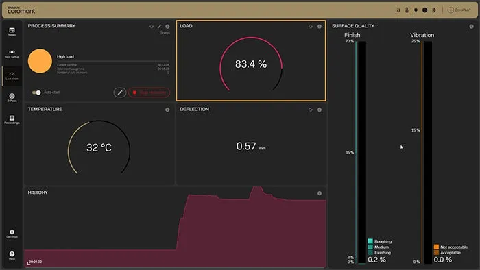 サイレントツールプラスをCoroPlus®コネクティッドを搭載した機械と組み合わせて使用することで、サイレントツールプラスと工作機械の連携動作を行うことができます。サイレントツールプラスのびびり、工具負荷、たわみ量、防振機構温度にしきい値を設定し、加工中にそれらのしきい値を超過すると、工作機械に信号を送り加工の自動停止をトリガーすることができます。