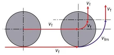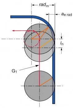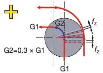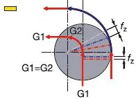 직선 절삭(G1)의 경우 가공물 벽의 이송 vfm은 프로그램된 이송 vf와 동일한 반면 반경(G2) 주위의 원주 이송은 공구 중심 이송보다 높습니다. 따라서 날당 이송 fz를 유지하려면 테이블 이송 vf를 줄여야 합니다.