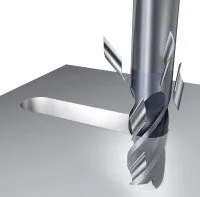 The drill depth of a centre cutting end mill is limited by the length of the chip flute and also by chip evacuation capability. For deeper slots, use a peck cycle. When drilling, use a low feed: approx. 50% of the feed recommended for milling.